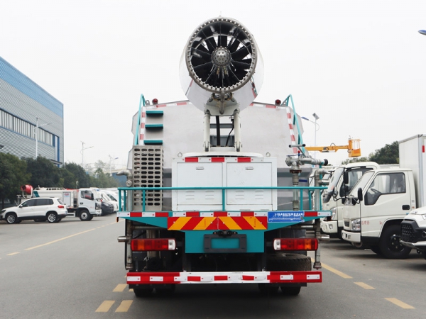 我公司抑尘车标配:前对冲、后洒、侧喷、后置式工作平台、平台上有高压水炮(可 360°旋转,可调成柱状最大射程 35 米,也可调成雾状最大射程 15 米,(可调成: 直冲状、大雨、中雨、小雨、毛毛雨),配备优质大功率专用洒水泵,杂物过滤网,国标通用 65 型消防接口(可通过消防栓加水),2 根引水胶管。水泵、取力器、球阀、滤网均为国家标准产品,主管道加粗,法兰垫、法兰盘加厚,前对冲,大通径球阀,具有性能优良,工作可靠、效率高、流量大。尾部加装雾炮能有效的对雾霾、灰尘进行有效的抑制效果。我公司生产的多功能抑尘车,利用水雾吸附空气中的粉尘,淡化空气中的污染颗粒物浓度,达到(固尘、降尘、清洁净化空气)的效果,有效缓解城市尘粒空气污染现象并可用于公共场所(增湿、降温、消毒、除臭)。可以改善空气质量,用于降低 PM10、PM2.5,被誉为 PM2.5 治理神器。同时也可以改善工矿作业物料堆放、建筑施工和爆破拆除引起的灰尘污染,亦可用于城市大气治理、农药喷洒、消毒等。