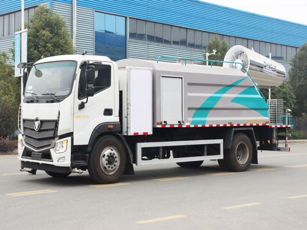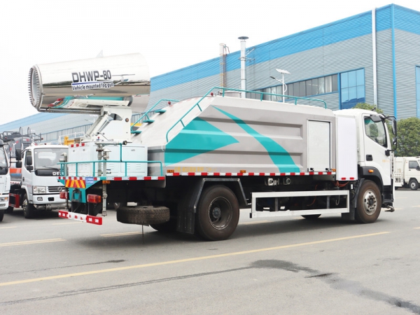 工作原理:采用自吸式双级离心泵,效率高、洒水宽度大、水枪射程远,低压水泵由底盘变速器取力器通过传动轴直接传动。雾炮机组由底盘电池带动雾炮风扇电机、不锈钢多级离心泵,进行喷雾降尘工作。