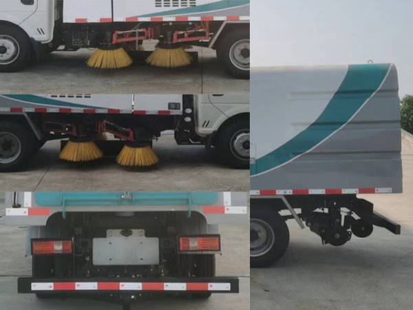 3. 采用“中置四扫盘+喷雾降尘装置+中心隔板+后置吸嘴”的结构布局,让清扫过程中砂石不在飞溅扬尘,此布局便于清扫装置与吸盘的调整与维护,转场作业时整车通过性好。